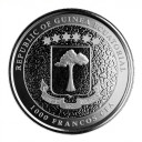 Die Giraffe ist das Nationaltier von der Republic of Guinea Ecuatorial und mit seiner Höhe das größte Tier. Abgebildet sind zwei Giraffen in einer Savannenlandschaft bei Sonnenuntergang. Die Münze ist gesetzliches Zahlungsmittel